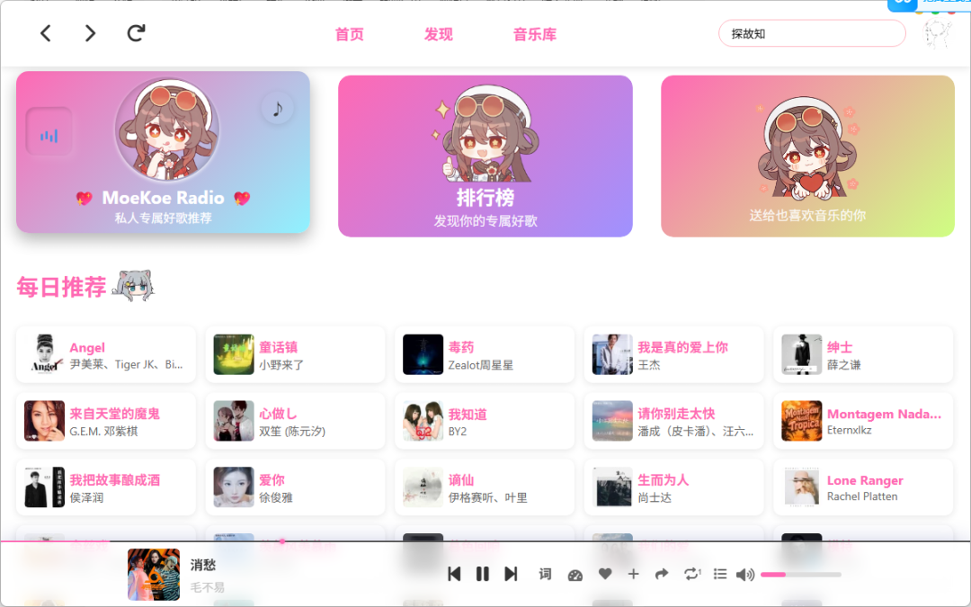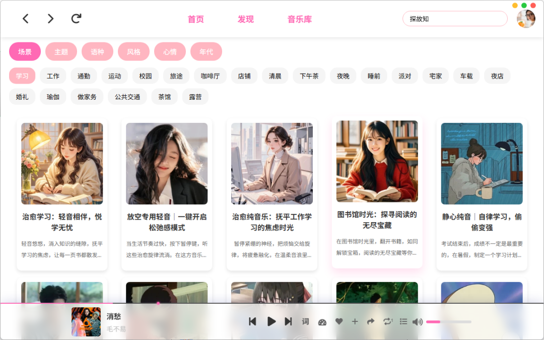 在【发现】界面下,您还可以听取已经分类好的,同类型歌曲。