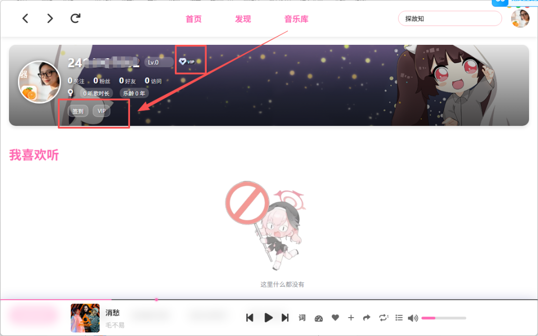 登录进来以后,您就能看到。在您的用户账号下方有个签到。签到就能获得VIP权限。这样您再听歌就能完整听了,并且VIP高品质歌曲也可以听。