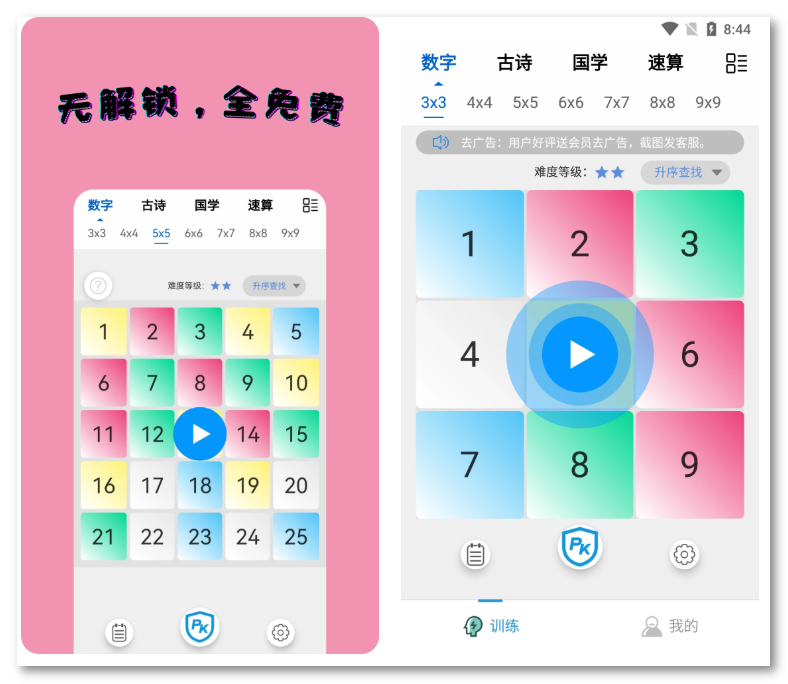 它界面美观,支持多种训练模式,包括数字、古诗、国学、速算等,难度分级细致。训练过程中,你还能学习古诗和国学知识。功能亮点包括提示音和震动提醒,PK模式让训练更有趣。总体而言,舒尔特训练Pro不仅提升专注力,还能丰富知识储备。