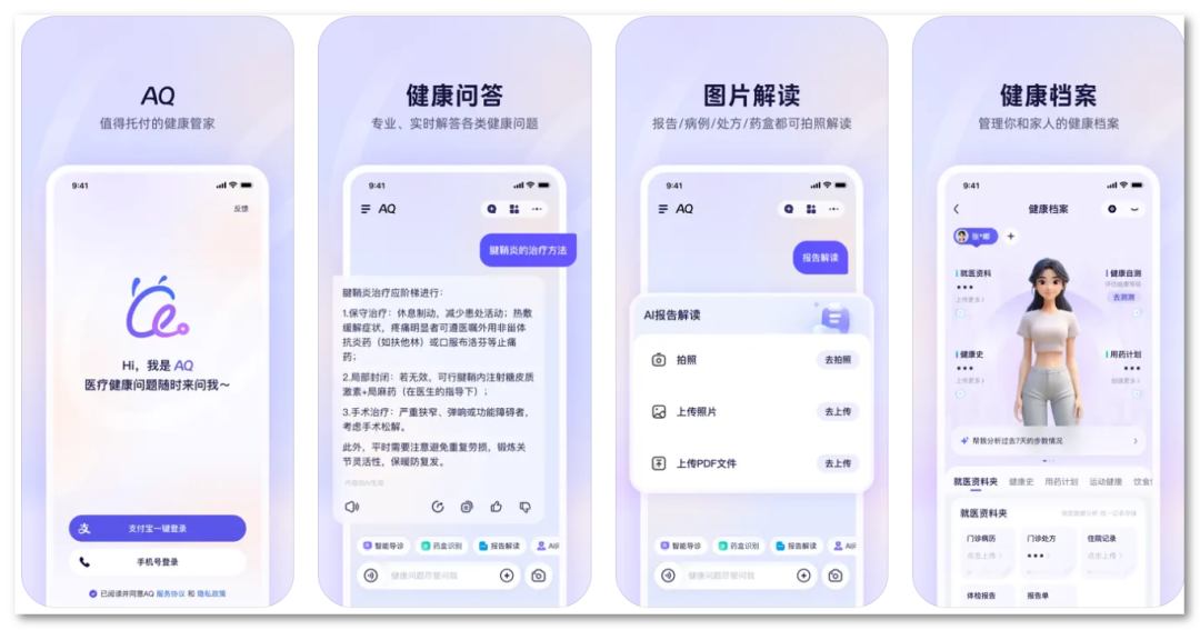 AQ是蚂蚁集团旗下的一款AI健康应用软件;软件支持安卓、iPhone和iPad。