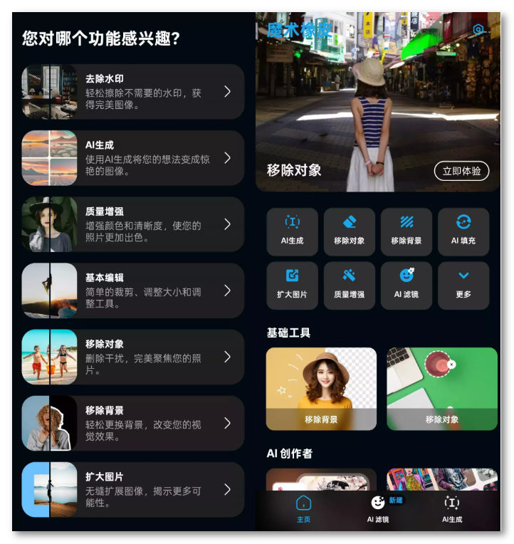 它界面精美,操作简单,功能丰富多样,几乎涵盖了所有常用的图片编辑需求。具体功能包括去除图片背景、一键抠图、删除多余物体、提升图片质量、模糊图片变清晰,以及AI滤镜、AI生成图片等高级功能。其中,AI滤镜支持多种风格转换,如素描、漫画、艺术、油画等;AI生成图片功能则提供了丰富的风格选择和高级设置选项,轻松生成高质量图片。总体而言,魔术橡皮不仅实用,而且操作便捷,是手机图片处理的不二之选。