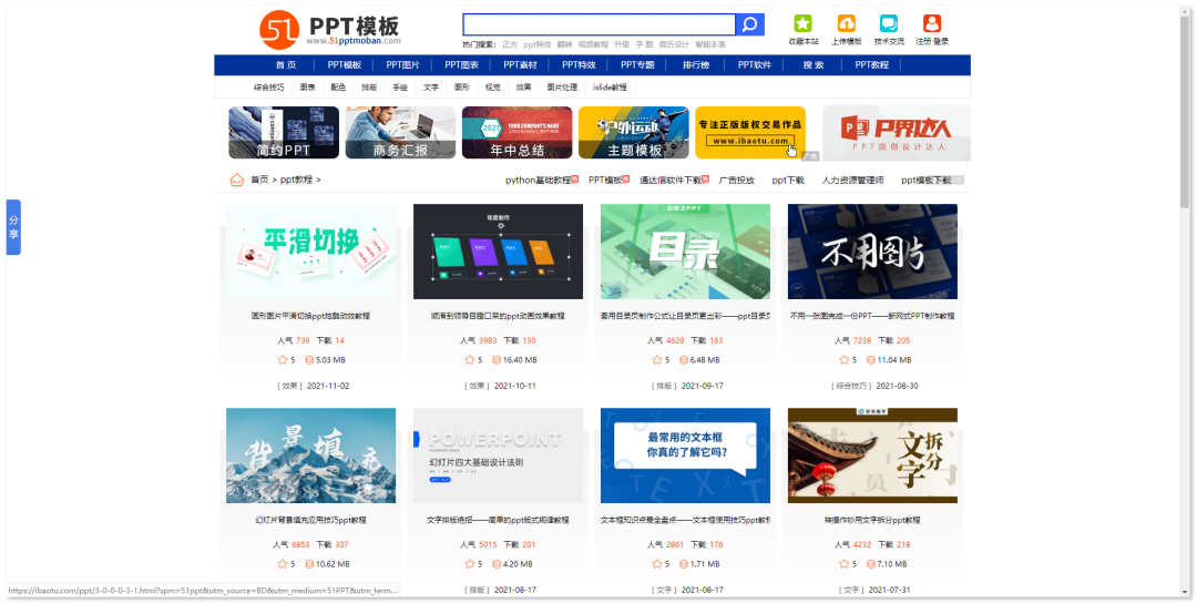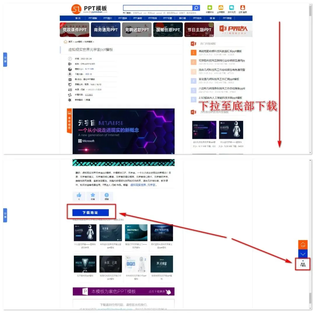 在这里只要你能想的到的PPT类型模板,绝大部分还是都能找得到的,没有任何繁杂的套路界面,直接点击便可直达相关模板的详情页。但模板的下载按钮却藏得十分隐秘,需要我们将界面下拉至底部,按下“点击进入下载页面”就能直接下载啦。细心的朋友会发现,站长还特意为大伙儿准备了“排行榜单”,在这里你能够轻松发现站内某个资源类目的榜单排行靠前资源。