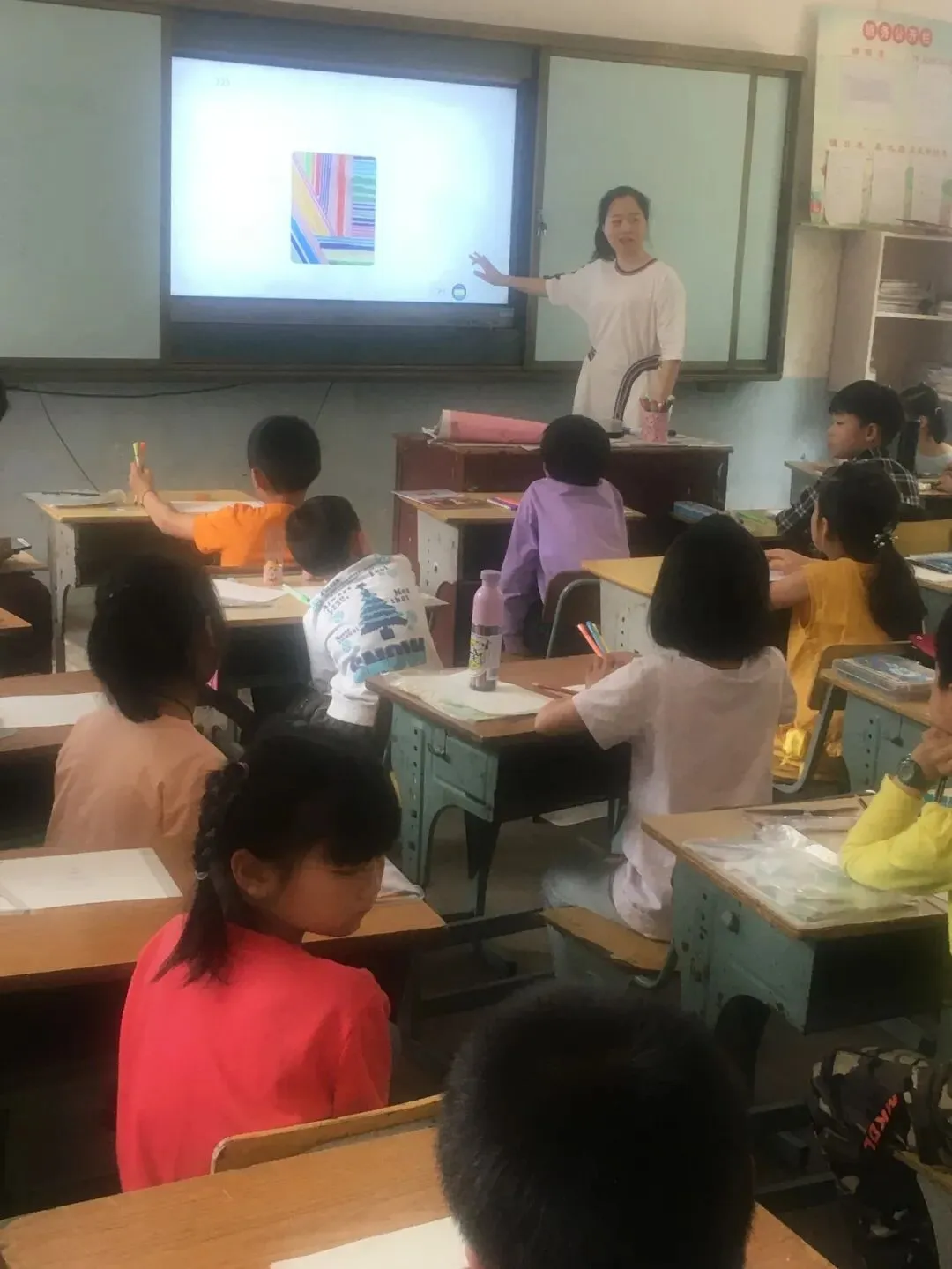 第三节是东城小学潘秋香老师带来的《条纹乖乖》美术课,潘老师领着孩子们欣赏身边的条纹装饰,通过画出多彩条纹搭配和设计条纹服装中感受条纹的时尚美。
