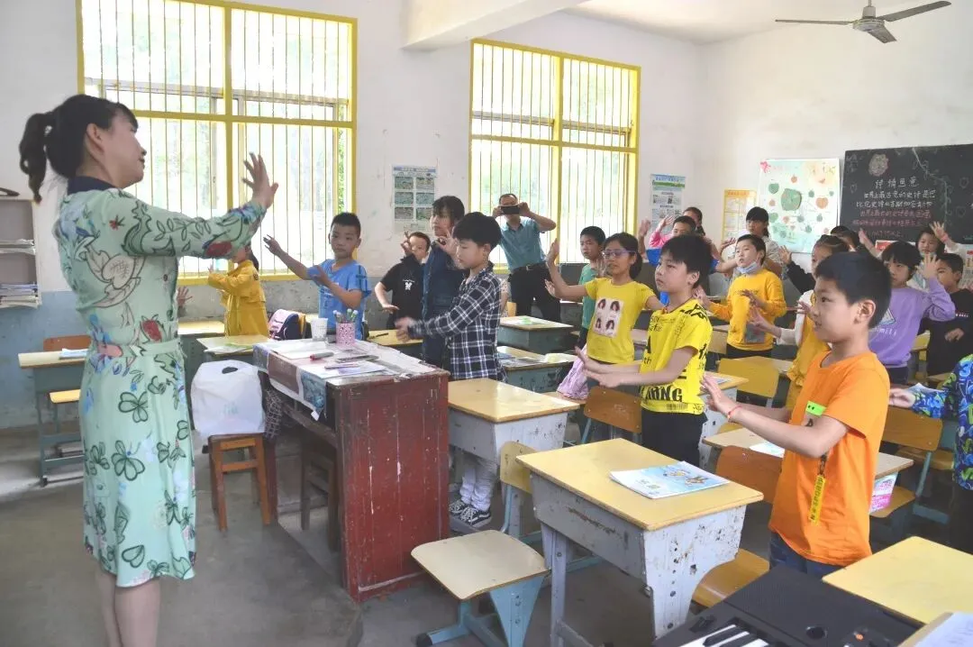 窗里是希望,窗外是期望。基地学校校长袁志华、副校长陈灿、督学周仁德以及湾塘小学全体老师纷纷围在教室外,望着孩子们一张张开心的笑脸,听着孩子们大胆地试唱音符,不知不觉已随着课堂走进了美妙的音乐世界。