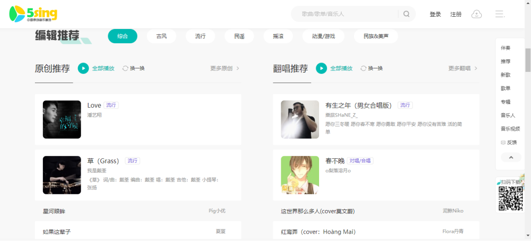 提供的音乐风格包括古风、流行、民谣、摇滚、动漫、民族、游戏等好听的音乐,基本上全部都可以免费下载,还支持按照原创以及翻唱进行查找。