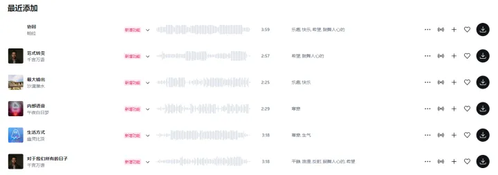 打开后将网页翻译成中文会发现部分音乐都进行了详细分类,你可以直接点击分类搜索喜欢的歌曲,也可以在最近添加中找到最新上线的歌曲。