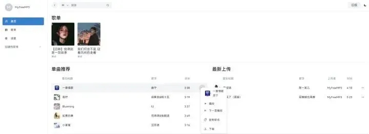 打开歌单就可以看到来自不同音乐给出的歌曲,点击播放就可以看到下载按钮,同样下载的的歌曲会直接保存为MP3格式。