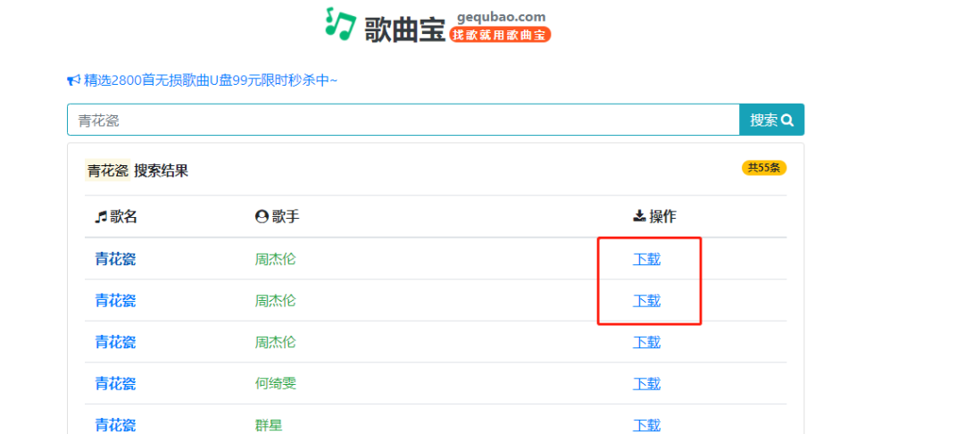 打开页面可以看到当下流行的音乐单曲,还支持强大的音乐搜索功能,下载方式简单,每首歌曲都提供了下载按钮,可以下载多种格式的无损音乐。
