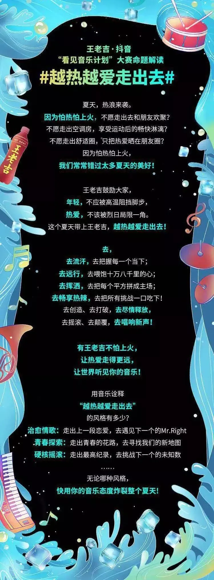 作为本次音乐作品征集赛的主题,同时也是王老吉夏季传播主题,“越热越爱走出去”希望将一份美好的价值观传递给每一位为梦想打拼的原创音乐人——鼓励年轻的音乐人们不惧户外天热,不惧前路坎坷,勇敢走出去实现自己的音乐梦。