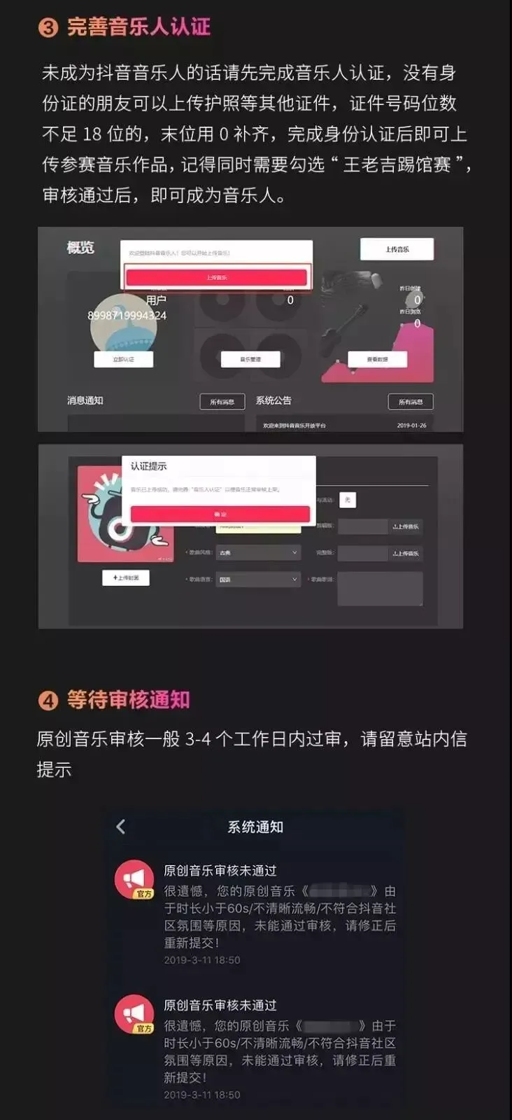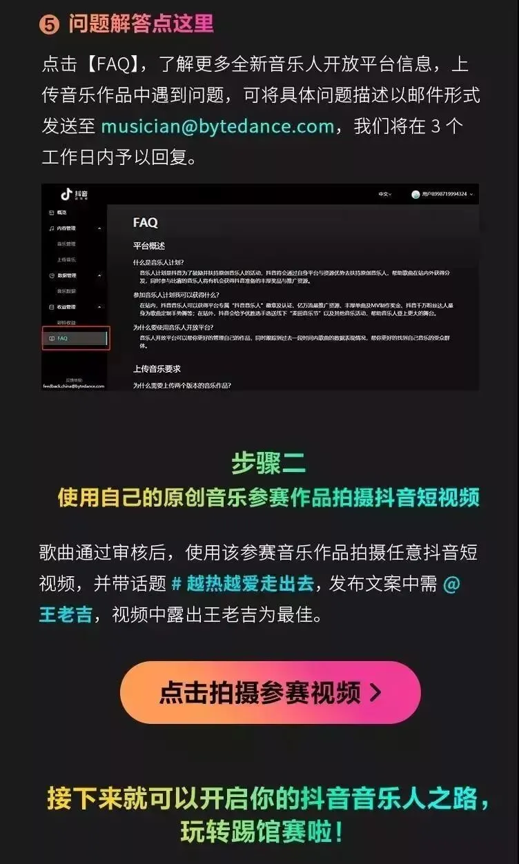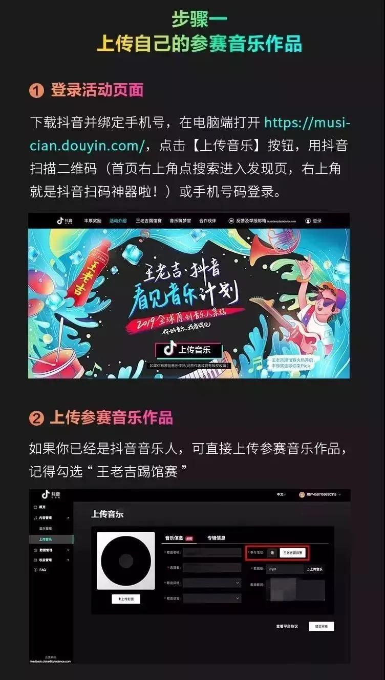 (2)如您仍未成为抖音音乐人:首先需要注册抖音账号,登陆音乐人开放平台(http://musician.douyin.com)填写相关资料上传参赛音乐作品,同时需要勾选“王老吉踢馆赛”,审核通过后,再使用该音乐作品拍摄一段抖音短视频,视频需带上话题#越热越爱走出去,发布文案中@王老吉,视频中露出王老吉为最佳。