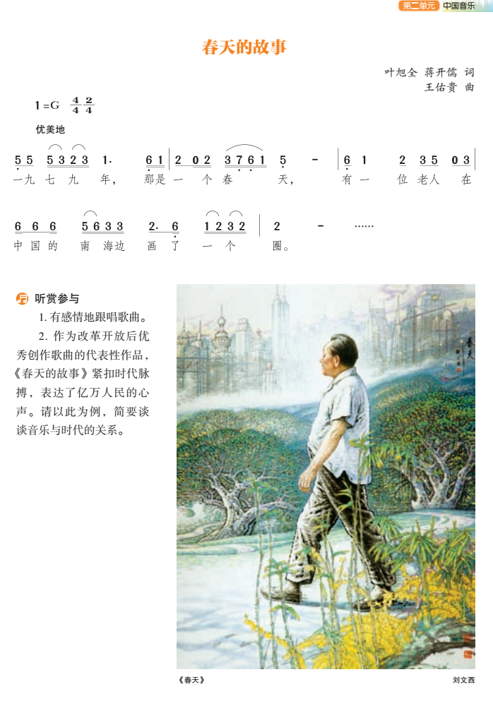 作为改革开放后优秀创作歌曲的代表性作品,《春天的故事》紧扣时代脉搏,表达了亿万人民的心声。通过此作品,理解音乐与时代的关系。