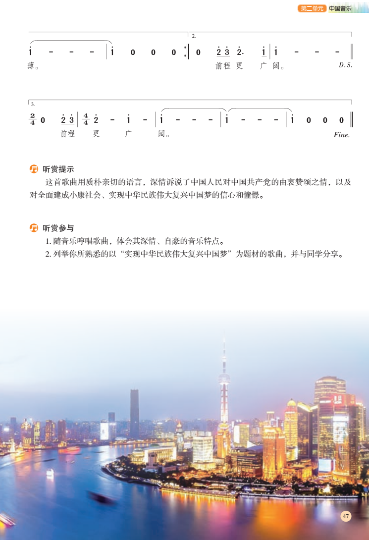 新时代呼唤新作品,新作品反映新时代。结合歌曲的创作背景,理解音乐的教育功能。培育和践行社会主义核心价值观,培养爱国主义情操。