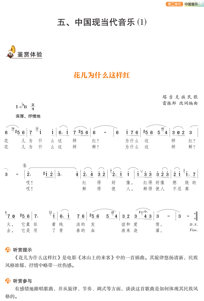 2.作曲家雷振邦说:“《冰山上的来客》中《花儿为什么这样红》这首歌 曲的曲调 , 是我在参加一次塔吉克族婚礼时搜集到的。它原本是一首舞曲 , 据说这首曲子是当地群众跳舞时最喜爱的。我感觉这曲调塔吉克民族特色很浓 , 又很适合于表现深沉、含蓄的感情 , 但由于原舞曲节奏较强、速度也较快 , 在改编为《花儿为什么这样红》时把节奏放慢了, 同时根据歌词的句法将曲调作了适当的调整 , 大致保持了原曲调的面貌。”对比聆听原民歌《古丽碧塔》,理解民歌与创作歌曲之间传承与创新的关系。