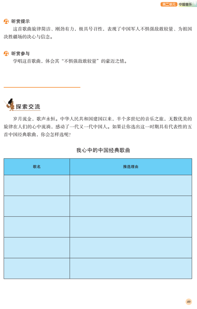 新中国成立后,许多音乐家为新音乐文化进行了不懈的探索与创造,他们追随着时代前进的步伐,用不绝于耳的歌声倾诉着理想、抒发着豪情、激励着斗志、欢呼着胜利。他们用手中的笔书写着七十余年的流金岁月。本课选取五首现当代有代表性的优秀歌曲供学生欣赏,旨在让学生感受时代发展的脉搏,见证祖国社会主义建设的伟大历程,培养爱国主义情操。