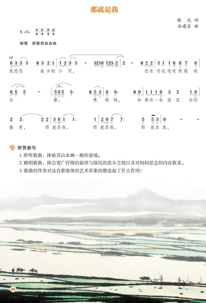 《那就是我》是一首真挚感人的抒情歌曲,仿佛一幅淡雅而又略显朦胧的山水画。通过对“小河” “炊烟” “渔火”“明月”的绵绵思恋,把一个远方游子对母亲和故乡的思念之情表达得淋漓尽致。