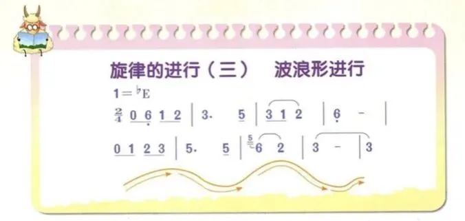 旋律由不同音高交替进行,所形成的旋律线条为波浪形。《让我们荡起双浆》就是一首旋律进行以波浪形为主的歌曲。