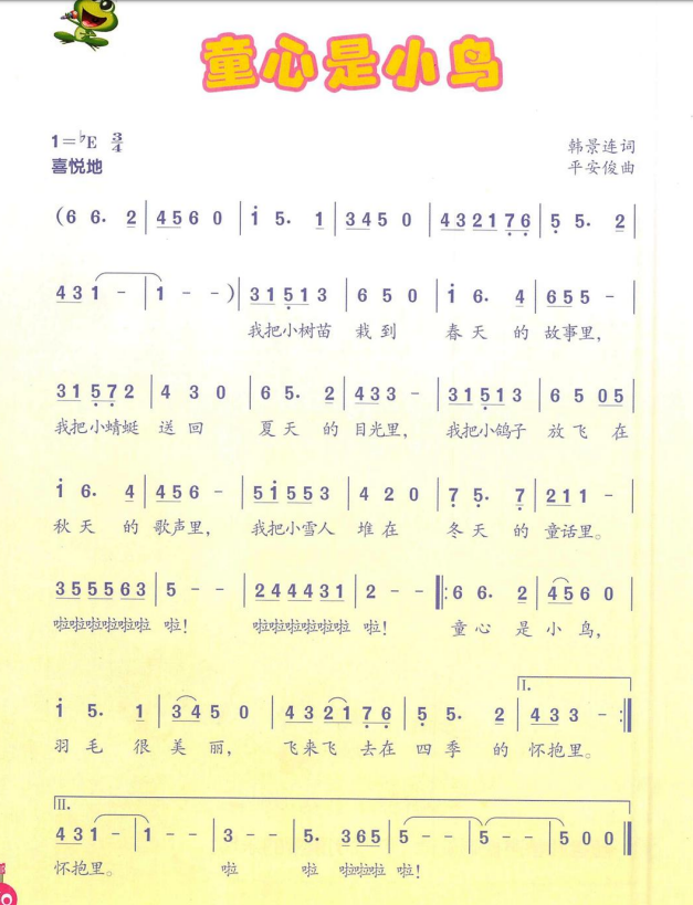 这是一首3/4拍的齐唱歌曲,通过富有诗意的歌词,十分形象地把儿童比拟成是一只快乐的小鸟,反映了儿童活泼向上、充满朝气的精神面貌。二段体结构:第一段由四个乐句,采用排比句式,节奏基本相同;中间用衬词“啦”连接 ,第二段旋律优美舒展。