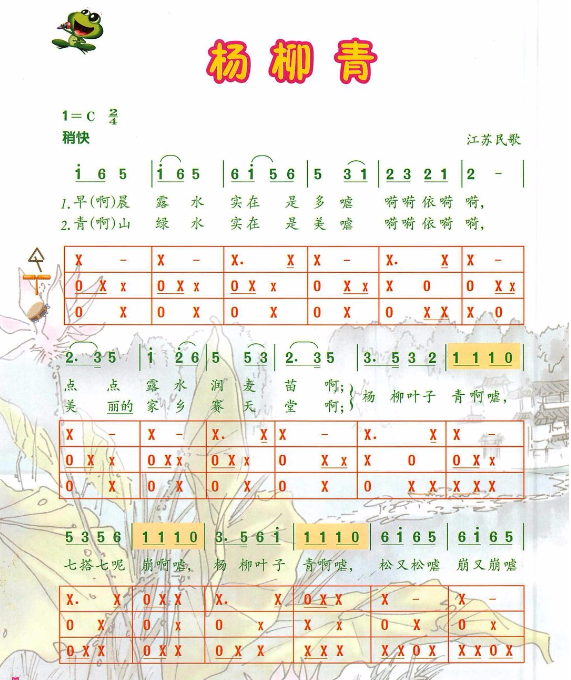 这是一首江苏地区的民间小调,以衬词“杨柳叶子青”得名。歌曲2/4拍,抒发了美好生活所带来的喜悦之情和对家乡的热爱。歌曲为五声宫调式,全曲欢快活泼、热情风趣。衬词在歌曲中占有十分重要的地位,具有浓郁的地方方言特点。