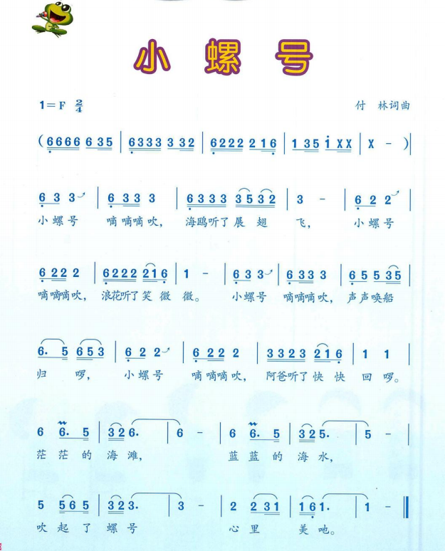 这是一首2/4拍、曲调欢快活泼的儿童歌曲。歌曲富有童趣地通过“小螺号嘀嘀嘀吹”抒发了少年儿童热爱生活、热爱大自然的美好心情。歌曲为二段体结构,第一乐段有四个乐句,曲调规整,第二乐段节奏拉宽,每句句尾拖长,运用了波音营造情境,曲调逐渐下移。