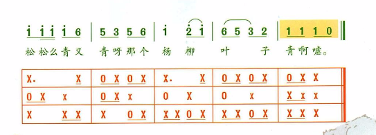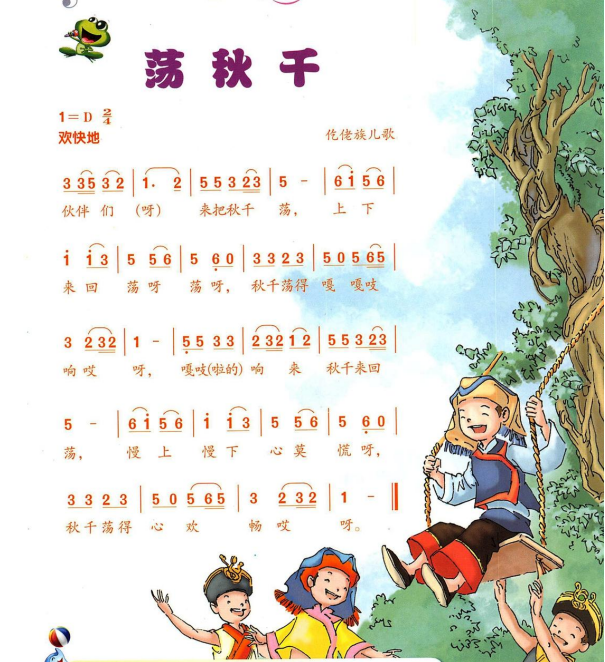 《荡秋千》是一首2/4拍,曲调活泼跳跃,节奏明快,反映仡佬族儿童生活情景的童谣,结构方整而短小。单二部曲式,除第二部分首句与第一部分的首句同尾换头外,其余两个乐句完全一致,五声宫调式。