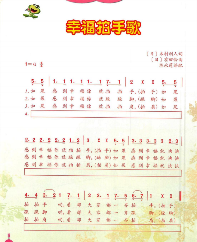 《幸福拍手歌》是一首4/4拍的日本儿童歌曲。歌曲速度稍快,情绪活泼,节奏紧凑,旋律以发展的递进式乐句组成,在弱起节奏及附点八分音符的动力性节奏推动下,给人以活泼稚气的跳跃式行进感。歌曲结合了儿童生活中的动作,边唱边做,游戏性强。