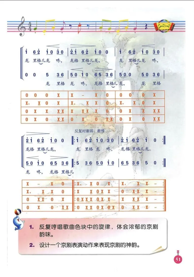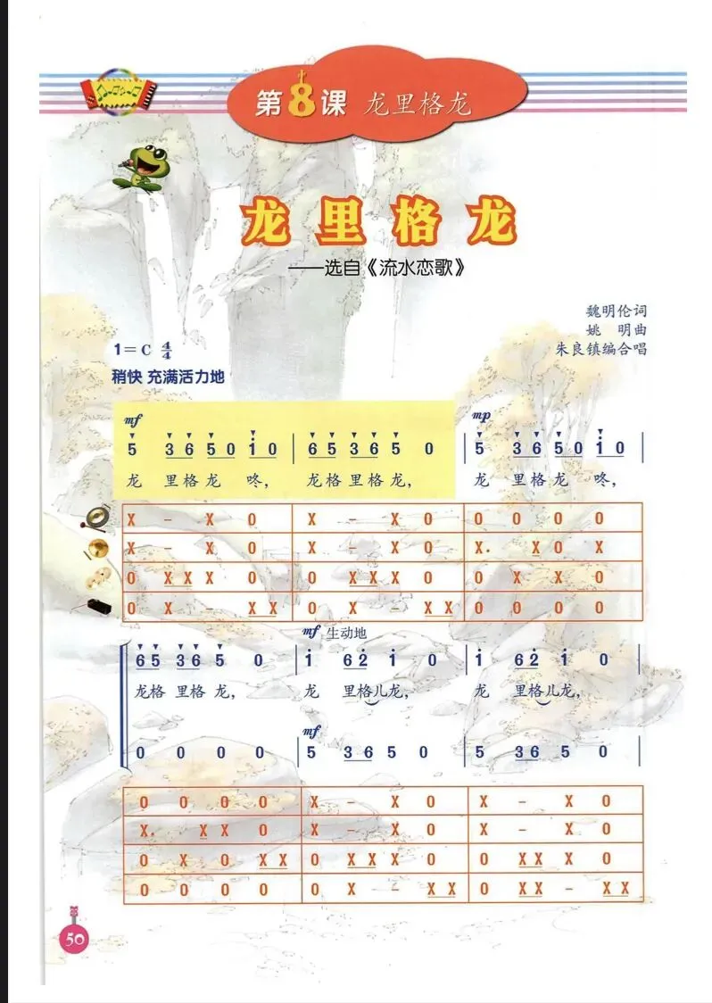 京歌《龙里格龙》是合唱《流水恋歌》中的选段,曲调主要采用京剧西皮唱腔中的音乐素材编写。全曲由一个主题旋律构成,合唱部分形成带点轮唱感觉的二部合唱。歌词“龙里格龙”是京剧中常用的象声词。