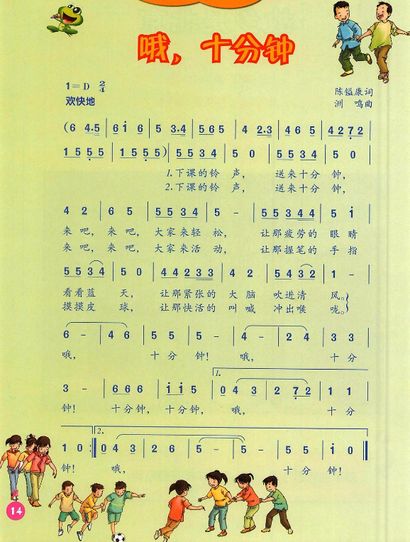 这是一首2/4拍,二段体的儿童歌曲。曲调欢快、活泼,语言形象生动。歌曲通过对孩子平日课间十分钟的描写,表现了孩子们在紧张的学习后,自由欢乐的心情。第一段节奏紧凑,第二段转为舒展。