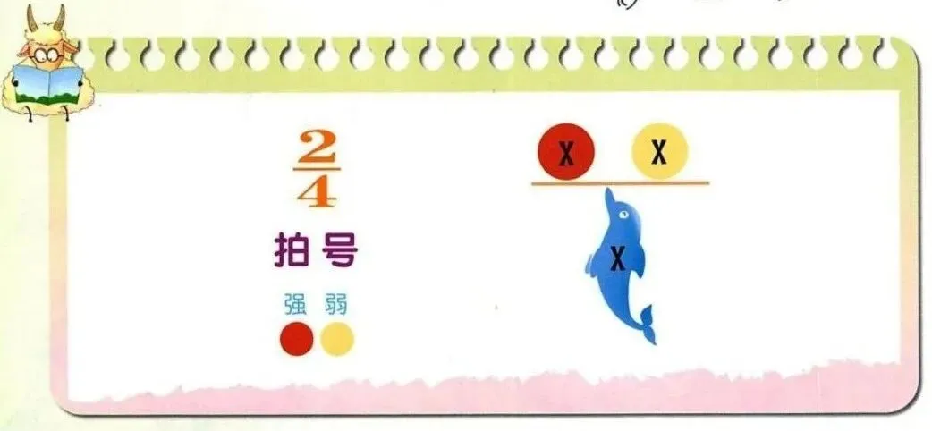 拍号:表示每小节中基本单位拍的时值和数量的记号。拍号的上方数字表示每小节的拍数,下方数字表示每拍的时值。如2/4表示以四分音符为1拍 ,每小节有 2 拍,强弱规律为:强、弱。