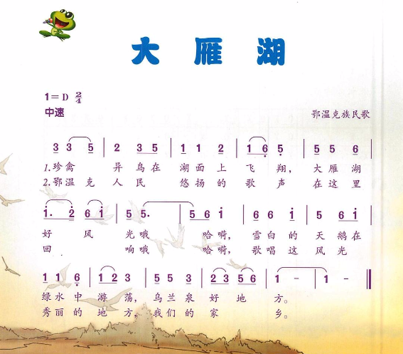 这是一首鄂温克族民歌。曲调优美抒情、悠扬动听,富于歌唱性。歌曲通过对大雁湖景物的描绘,抒发了人们热爱家乡的真切情感。歌曲为2/4拍,结构为四个乐句组成的一段体。曲调中切分节奏的运用使音乐富有动感,大跳的使用刻画了鄂温克族人民粗犷豪放的性格。