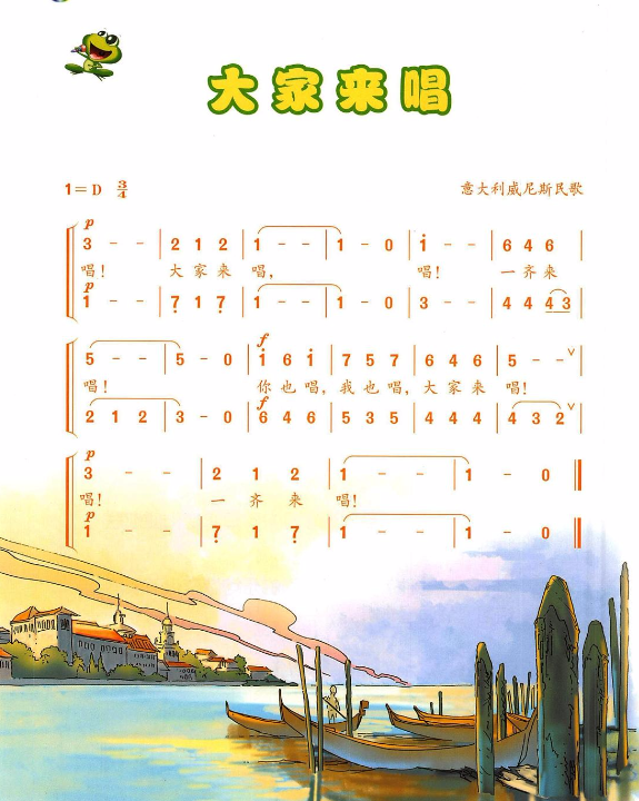 这是一首3/4拍的意大利威尼斯民歌,演唱形式是二声部合唱。全曲以优美、流畅的旋律,简洁的语言生动地描绘了孩子们围成圈,手拉手,边唱、边跳、边舞的欢乐情景。