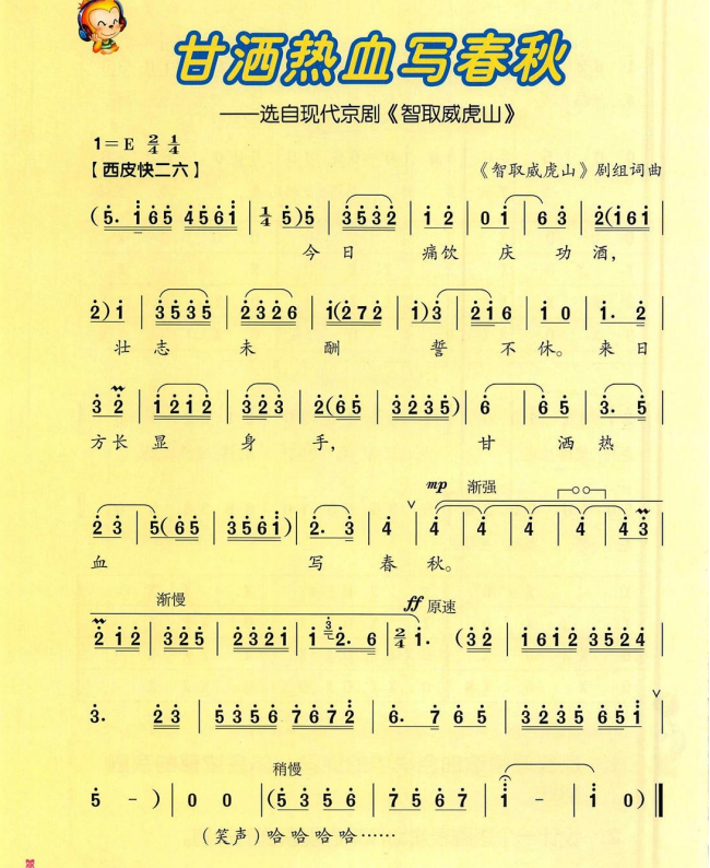 《甘洒热血写春秋》是现代京剧《智取威虎山》当中的选段。全曲采用京剧西皮快二六板式,铿锵有力,结束句“甘酒热血写春秋”在高音区采用了京剧中的拖腔手法,力度由弱渐强,淋漓尽致地表现了杨子荣英勇豪迈的气概。