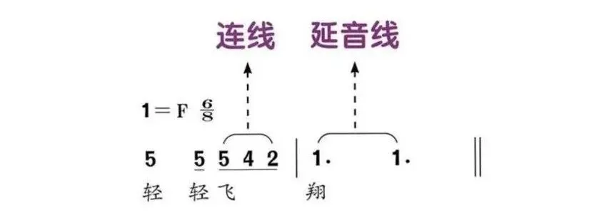 延音线用于相同的音符之上,表示演唱或演奏时相当于一个音符,时值等于所有这些音符的总和。