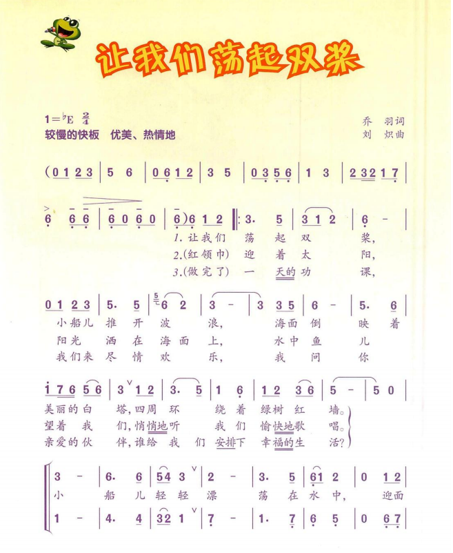 《让我们荡起双桨》是影片《祖国的花朵》的插曲,是一首合唱歌曲。歌曲2/4拍,曲调优美抒情,富有动感,形象地描绘了孩子们划着双桨、轻舟前驶的情景。带休止的节奏型贯穿全曲,起伏的旋律层层展开,富有动感。
