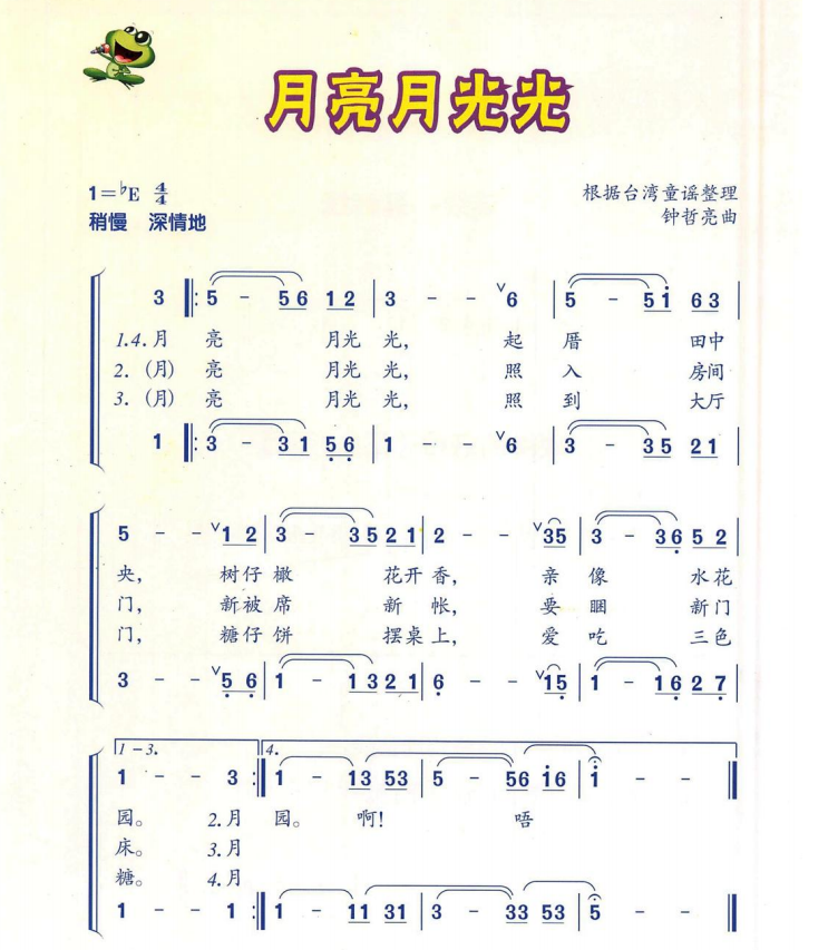 这是一首4/4拍,以台湾童谣为歌词的创作歌曲,旋律汲取了台湾地区的音调特点,具有鲜明的地方色彩,是一首二声部合唱曲。歌曲由四个乐句组成,节奏基本相同,音调抑扬起伏,优美流畅,勾勒出一幅月夜美景。