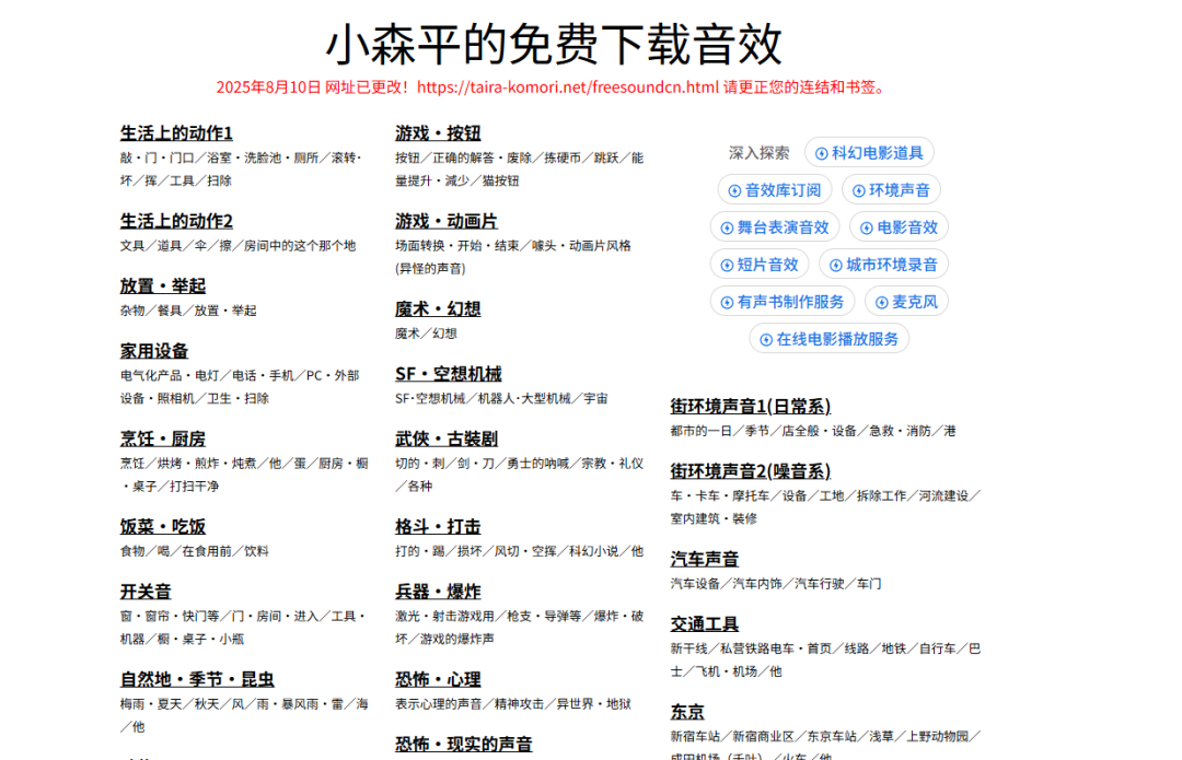 “小森平的免费下载音效”是一个由个人维护的免费音效网站,以其简洁实用和明确的授权而受到许多创作者的喜爱。