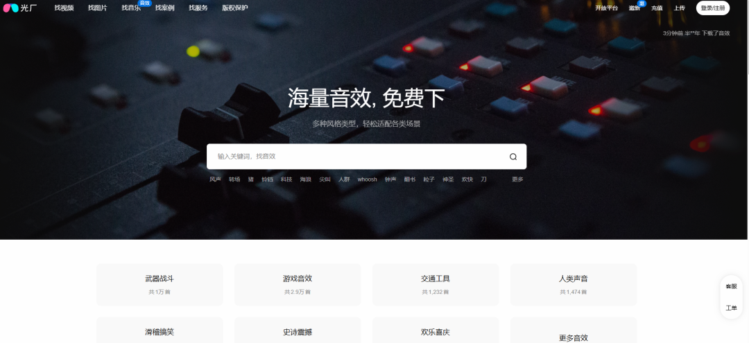 光厂是国内音效素材领域的领先平台之一,尤其在国际化搜索和下载体验上为中文用户做了大量优化。