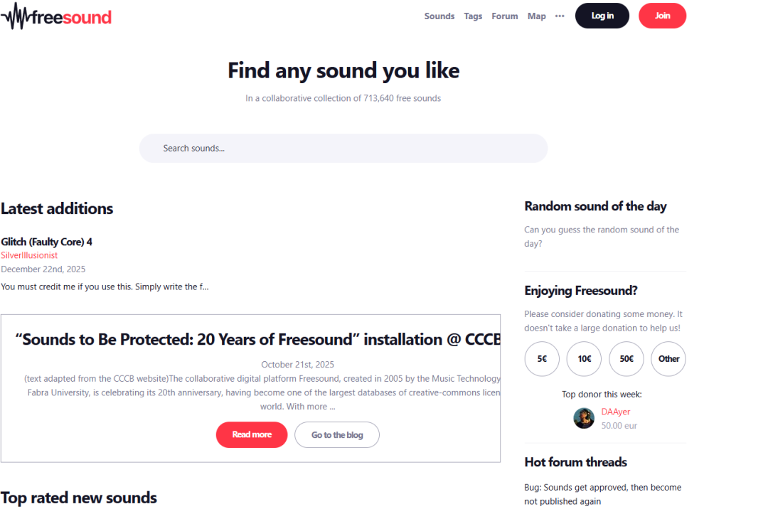 Freesound 是一个基于社区的音频共享平台,其核心概念是构建一个由用户共同创建和维护的庞大音效库。