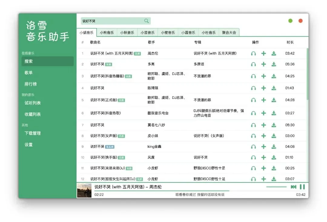 这个工具其实是将各大音乐平台整合在一起,包含搜索、歌单、排行榜等核心功能,同时可取可以试听、下载、添加收藏等。其中部分平台可以收听和下载其他平台的收费歌曲,甚至是无损音乐,你懂的。