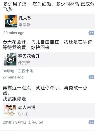 近期,网易云音乐公关人员在朋友圈很是活跃,经常转发几首知名歌曲,如上图所示——S.H.E,任贤齐,李宗盛。它们都有一个共性——系近期网易云最新被授版权歌曲。