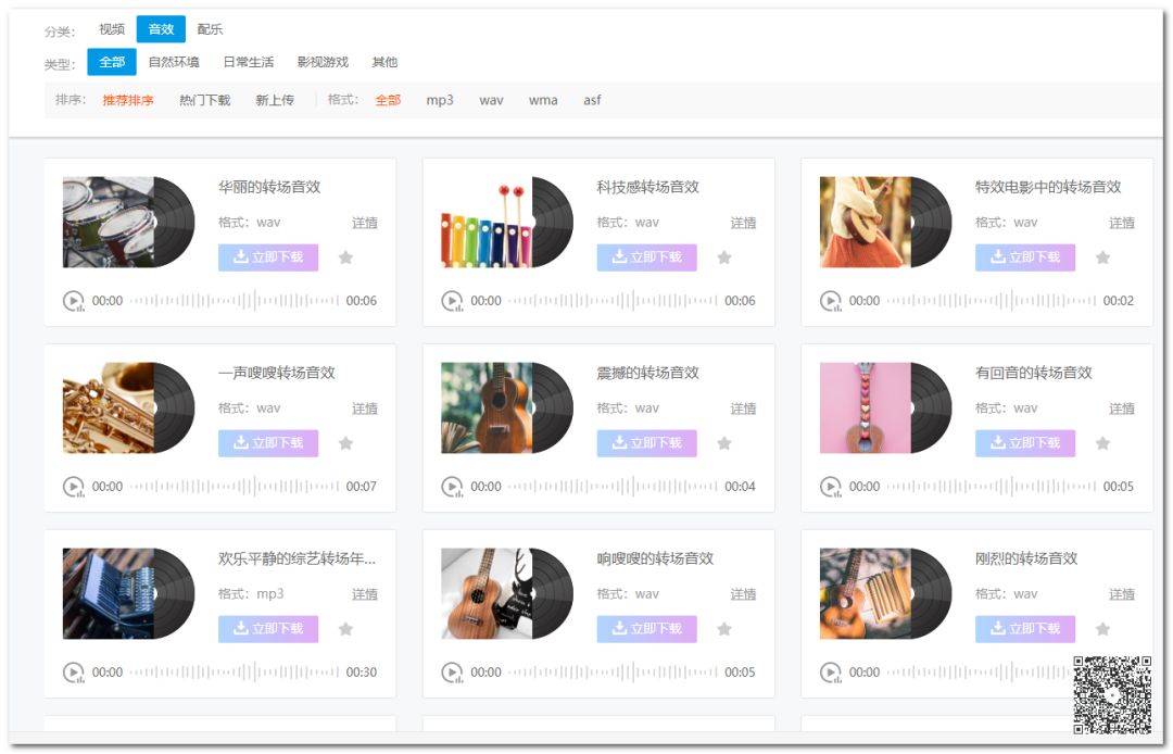 3.下面来实打实的测试一下下载功能,下载前需要找到音效素材的网址,如下图所示的页面,随便选择一个音效素材来下载一下。