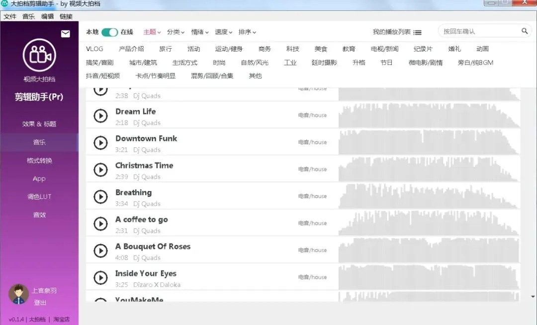 里面的音乐基本都经过了筛选,所以音乐质量非常高,基本上你只需要确定自己想要什么类型的音乐,然后通过软件里的分类选择功能,两分钟就能找到自己满意的音乐。