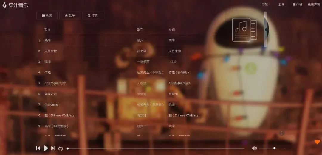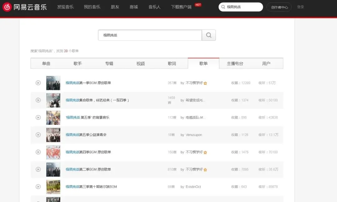 比如,搜索“极限挑战”,你就会发现有人把极限挑战里面的所有BGM都找了出来,并且创建了歌单,这样我们只需要在这里面找BGM就可以了。http://guozhivip.com/yinyue/这个是我平时找音乐时的辅助网站,因为很多网站不支持音乐免费下载,或者要下载它们的播放器才能下载。