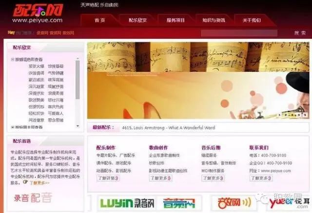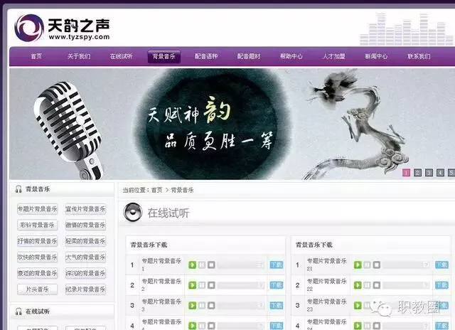 该网站有各种声音作品类型,包括广告片、专题片、宣传片、企业彩铃、企业专题介绍、游戏配音、少儿配音作品、汽车广告、医药广告、门店促销、产品直销片、公共语音等,可全方位为教师提供声音材料,运用到课程中。