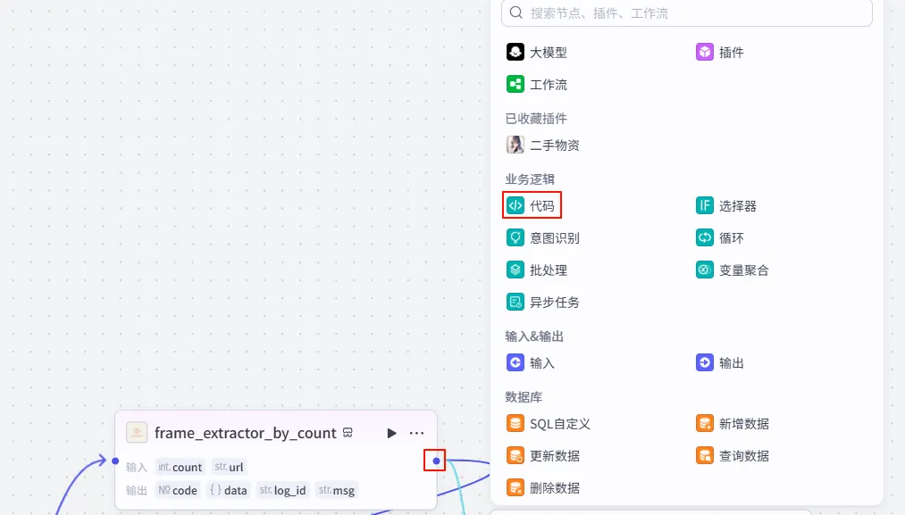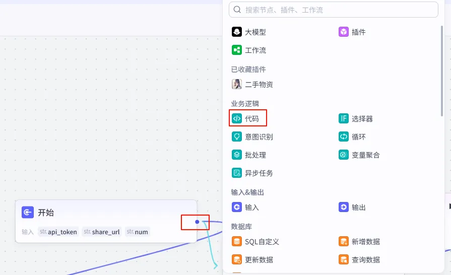 第一步:添加并配置代码节点在画布中添加 “代码” 节点(如下图)。