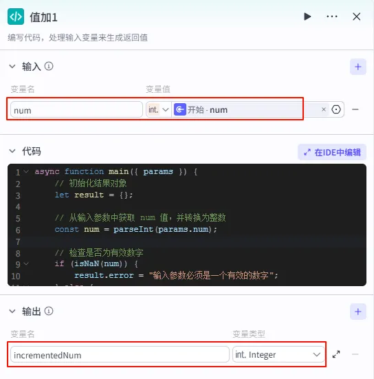 asyncfunctionmain({ params }){// 初始化结果对象let result ={};// 从输入参数中获取 num 值,并转换为整数const num =parseInt(params.num);// 检查是否为有效数字if(isNaN(num)){ result.error="输入参数必须是一个有效的数字";}else{// 将 num 加 1 并返回 result.incrementedNum= num +1;}// 返回结果对象return result;}
