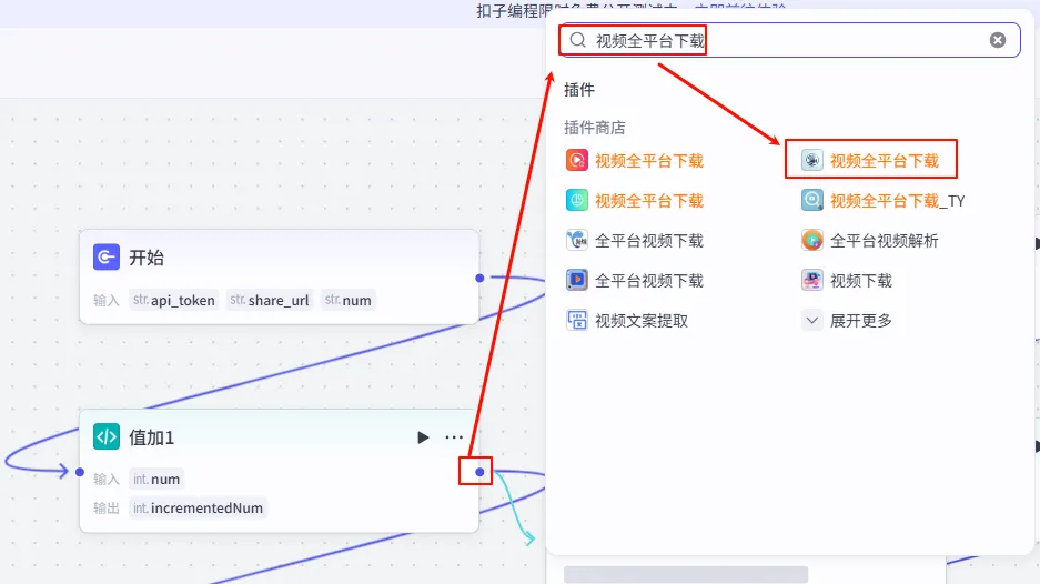 第二步:添加下载插件在节点库中搜索 “视频全平台下载”,认准下图所示插件,添加到画布。