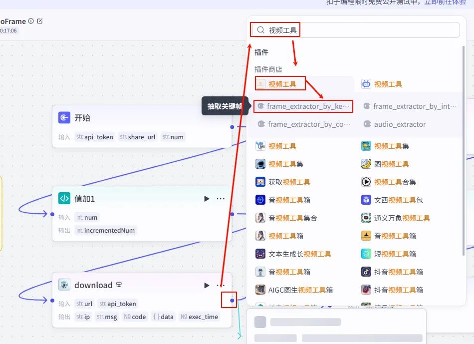 3. 添加抽帧插件 (Frame Extractor)点击画布搜索 视频工具,选择 frame_extractor_by_count(按数量截取),如下图所示: