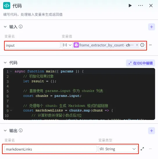 asyncfunctionmain({ params }){// 初始化结果对象let result ={};// 直接使用 params.input 作为 chunks 列表const chunks = params.input;// 处理每个 chunk,生成 Markdown 格式的超链接const markdownLinks = chunks.map(chunk=>{// 计算秒数并保留小数点后3位const seconds =(chunk.timestamp_ms/1000).toFixed(3);// 生成 Markdown 格式的超链接return`[截帧第${seconds}秒](${chunk.screenshot})`;}).join('\n');// 每行一条链接// 将结果存入输出对象 result.markdownLinks= markdownLinks;// 返回结果return result;}