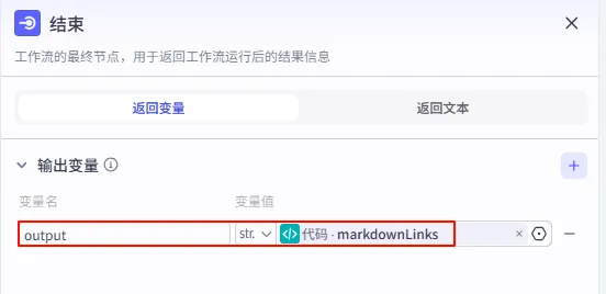 5. 设置结束节点将代码节点连接到 结束 节点,并配置输出变量: