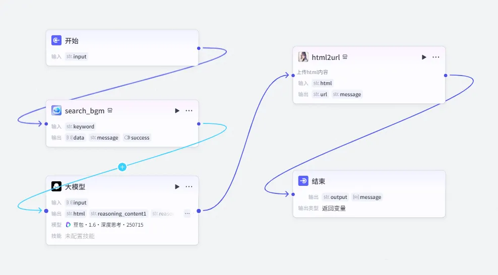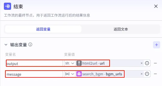 第三步:连接结束节点将发布网页节点连接到 结束 节点,并配置输出变量: